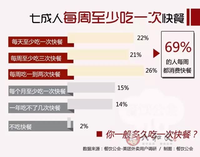 在用餐场景上,有25%的人会在工作日晚上选择快餐,而他们选择背后的原因是“下了班不想做饭”,这个数据与注重效率和时间,在工作日中午吃快餐的人非常接近。在摩登7的调查中,有22%的人表示他们每天至少吃一顿快餐,而每周吃三次快餐和每周吃一到两顿快餐的人分别占21%和26%。也就是说,69%的人每周至少会吃一次快餐。