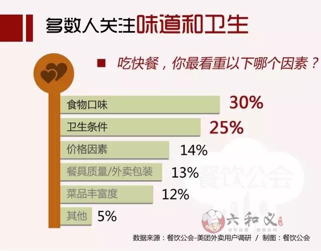 选择快餐时最关注的因素中,30%的人选择了口味,25%的人最注重的是卫生条件,只有14%的人首先关注价格问题,这和关注餐具质量、外卖包装这些视觉化体验的人比例差不多。