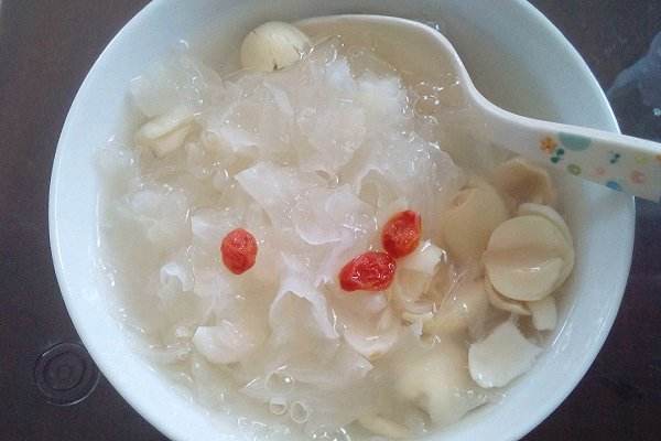 6.把清洗好的百合和冰糖放进汤煲,放几粒枸杞,煮至冰糖溶化即可食用