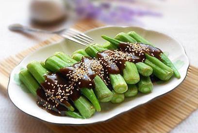 材料:秋葵、蚝油、生抽、糖、麻油、熟芝麻、盐、