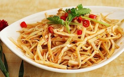 - 将料汁倒入笋丝中,倒入蒜末拌匀即可