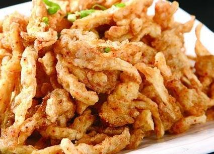 - 锅内放油,五成热的时候放入沾上了蛋液的平菇条炸至金黄