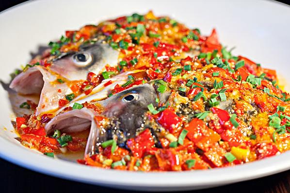 - 蒸好的鱼头端出后,撒上一些葱花,铁勺烧热油交上去即可